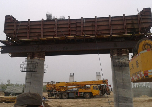 蓋梁模板采用托架法現澆,模板采用大塊組合鋼模,利用預留的孔洞安裝托架縱橫梁,在橫梁上拼裝好底模。然后先綁扎蓋梁鋼筋,經監理工程師檢查合格,再拼裝兩側的模板。